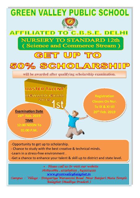 Our school has decided to give 50% scholarship in bus fee to the students who will qualify the master talent examination which is going to be held on 24 Feb. 2019 (Sunday) at 12:00 Noon to 2:00 PM. For more Details go to download option