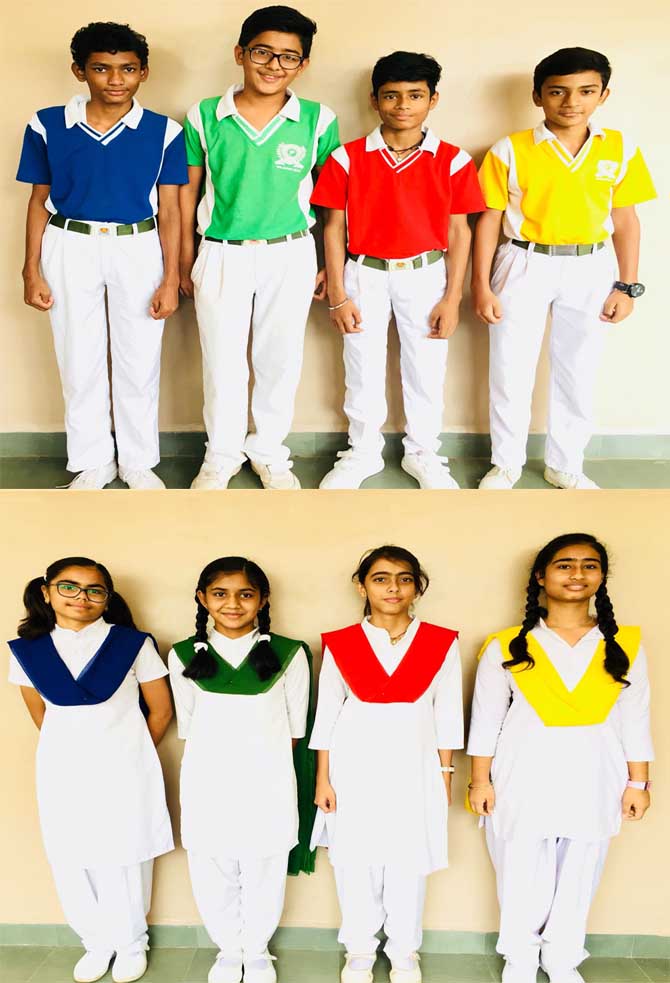 Boys:- Blue,green,red,yellow T-shirts according to student's respective house,white trousers,white socks,white shoes & school belt.