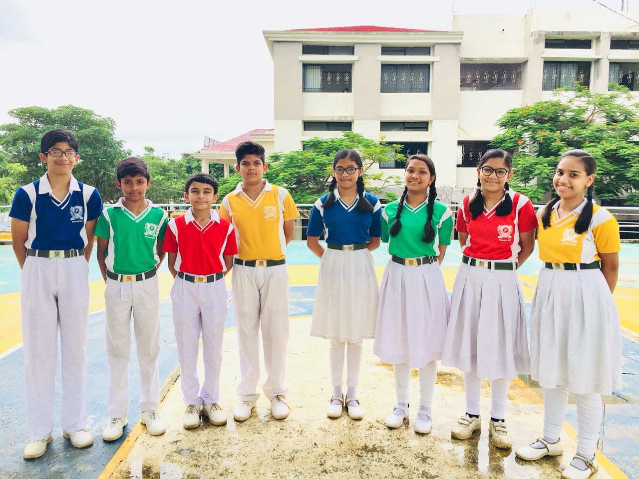 Girls:- Blue,green,red,yellow T-shirts according to student's respective house,white skirt,white socks,white shoes & school belt.