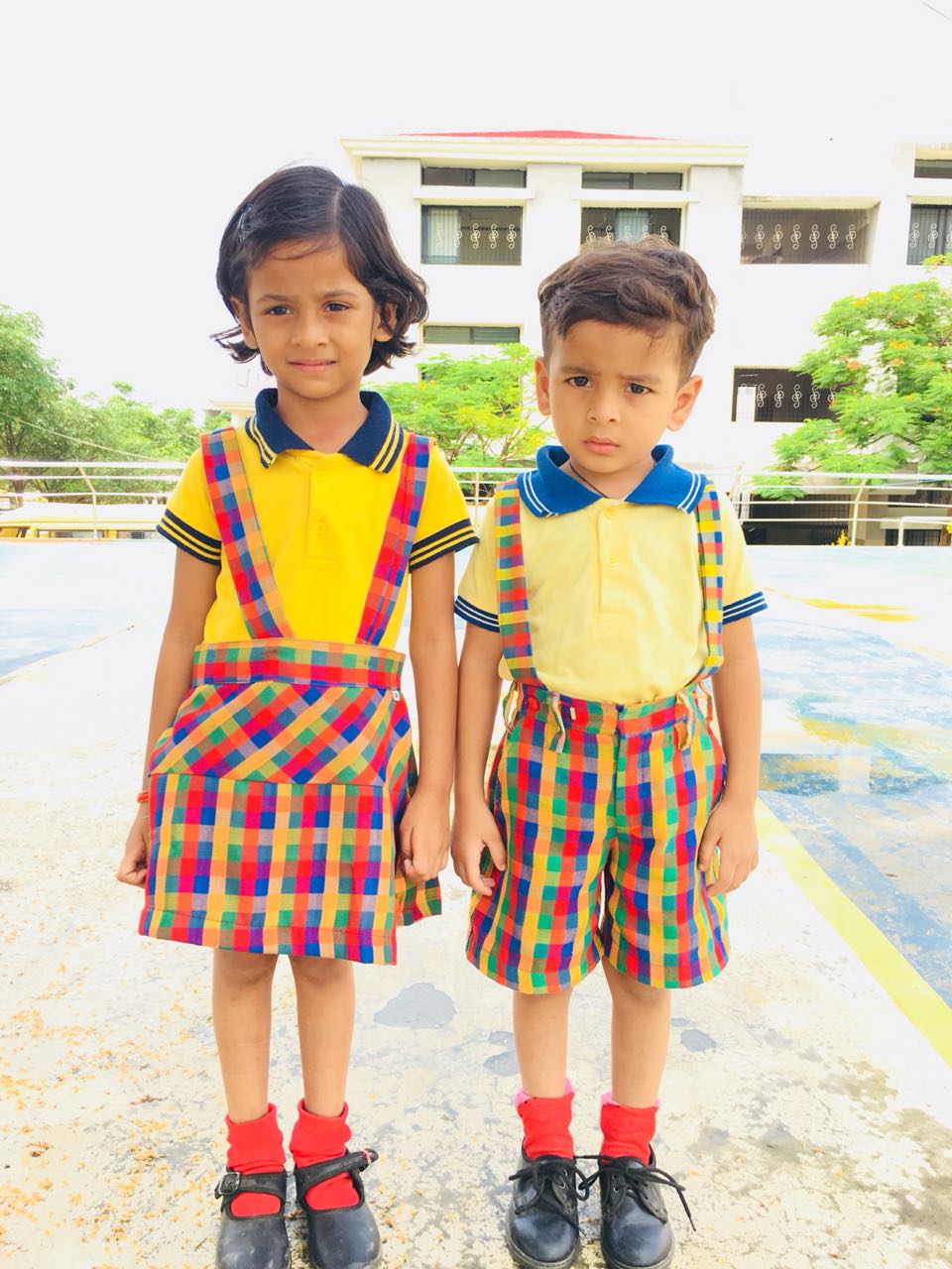 Girls:- yellow T-shirt,coloured checks skirt,red socks and black shoes.